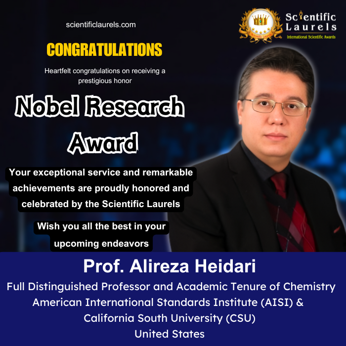 Prof. Alireza Heidari is a distinguished chemist and researcher with extensive international experience spanning over two decades. He obtained his B.Sc. in Pure Chemistry and M.Sc. in Physical Chemistry from Islamic Azad University (IAU), Tehran, achieving first-class honors with exceptional GPAs. He earned a Ph.D. in Chemistry from California South University (CSU), Irvine, USA, and a Doctor of Science (D.Sc.) diploma in Chemistry.