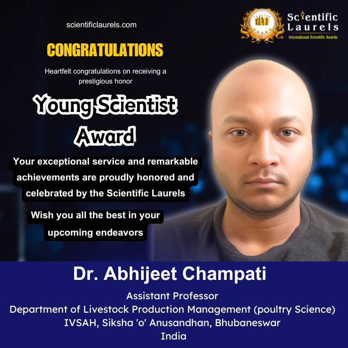 Dr. Abhijeet Champati Champati is highly eligible for the Young Scientist Award in Scientific Laurels based on his outstanding early-career achievements in poultry science and animal husbandry. His profile demonstrates a rare combination of academic excellence, competitive national rankings (AIR-01, ICAR-SRF), impactful research publications, patented technological innovation, peer-review contributions to reputed international journals, and nationally recognized awards. His work aligns strongly with national priorities in animal welfare, sustainable poultry production, value addition, and technology integration, making him a deserving candidate for the Young Scientist Award.