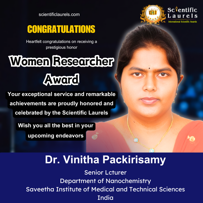 Dr. Vinitha Packirisamy’s outstanding academic record, pioneering research on luminescent metal nanoclusters, and impactful contributions to environmental and energy materials position her as a highly deserving candidate for the Women Researcher Award in Scientific Laurels.