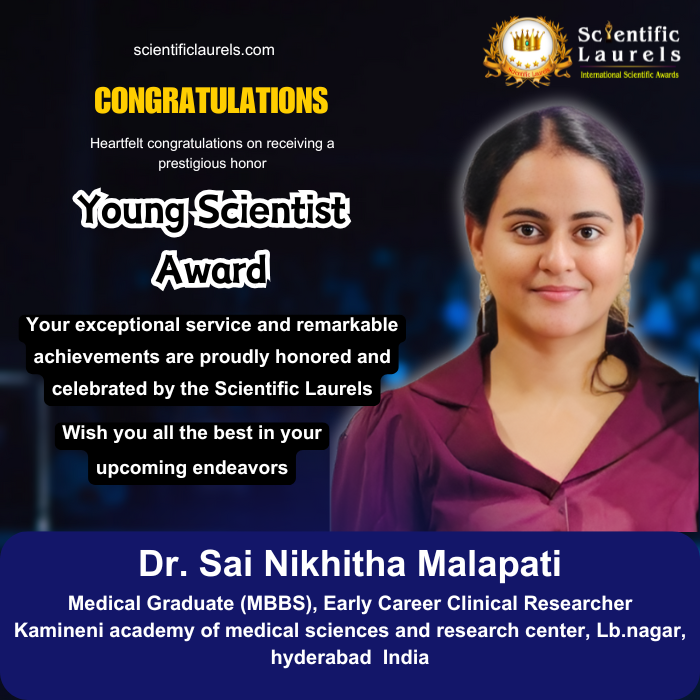 Dr. Sai Nikhitha Malapati has demonstrated an exceptional balance of clinical training, impactful research, and international academic engagement at an early stage in her career. With multiple peer-reviewed publications, leadership roles, global conference presentations, and recognition for academic excellence, she embodies the qualities of a promising medical researcher.
