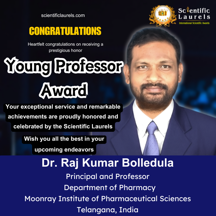 Dr. Raj Kumar Bolledula exemplifies the qualities of a Young and Dynamic Academic Leader, combining scholarly excellence, innovation, and institutional leadership. His diverse achievements—ranging from academic ratifications, impactful research, patent innovations, and effective mentorship—highlight his outstanding contributions to pharmaceutical sciences. Given his research productivity, patent portfolio, academic leadership, and commitment to scientific advancement, Dr. Raj Kumar Bolledula is eminently eligible for the “Young Professor Award” under the category of Scientific Laurels.
