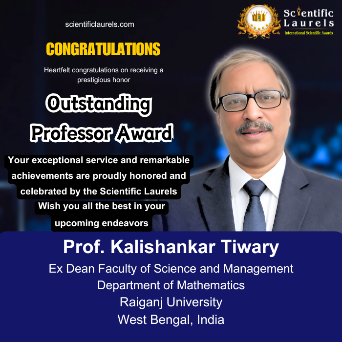 Prof. Kalishankar Tiwary’s distinguished academic record, prolific research output, doctoral mentorship, and transformative leadership in academic administration and quality assurance make him eminently deserving of the “Outstanding Professor Award” by Scientific Laurels. His sustained dedication to teaching, research, institutional development, and scientific leadership embodies the highest ideals of higher education and scholarly excellence.