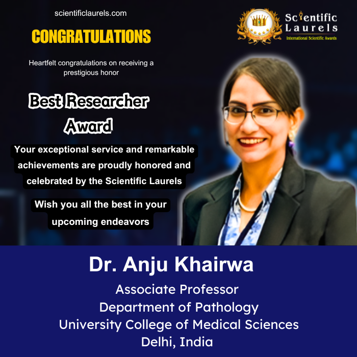 Dr. Anju Khairwa is exceptionally qualified for the Best Researcher Award (Scientific Laurels) due to her sustained and impactful contributions to pathology research and medical science. With over 55 peer-reviewed publications, strong citation metrics, international recognition, and prestigious awards including the International Innovative Researcher Award and ICMR Travel Grant Award, her scholarly work has contributed substantially to advancing diagnostic pathology and hematopathology. Her election to the National Academy of Medical Sciences (India), editorial leadership, active role in postgraduate mentorship, and extensive participation in international scientific forums further demonstrate her leadership and research excellence. Her continued commitment to advancing medical knowledge, clinical diagnostics, and medical education firmly establishes her as a highly deserving candidate for the Best Researcher Award (Scientific Laurels).