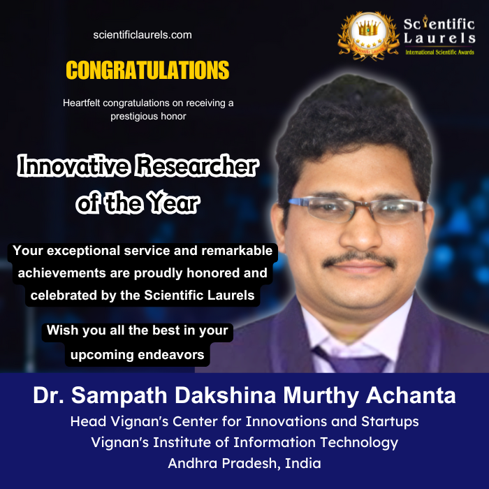 Dr. Sampath Dakshina Murthy Achanta's exceptional career in academia, research, and innovation, coupled with his leadership in advancing technological start-ups and his significant contributions to the research community, makes him a highly deserving candidate for the Innovative Researcher of the Year award at Scientific Laurels. His commitment to innovation, education, and research excellence continues to inspire the scientific community.