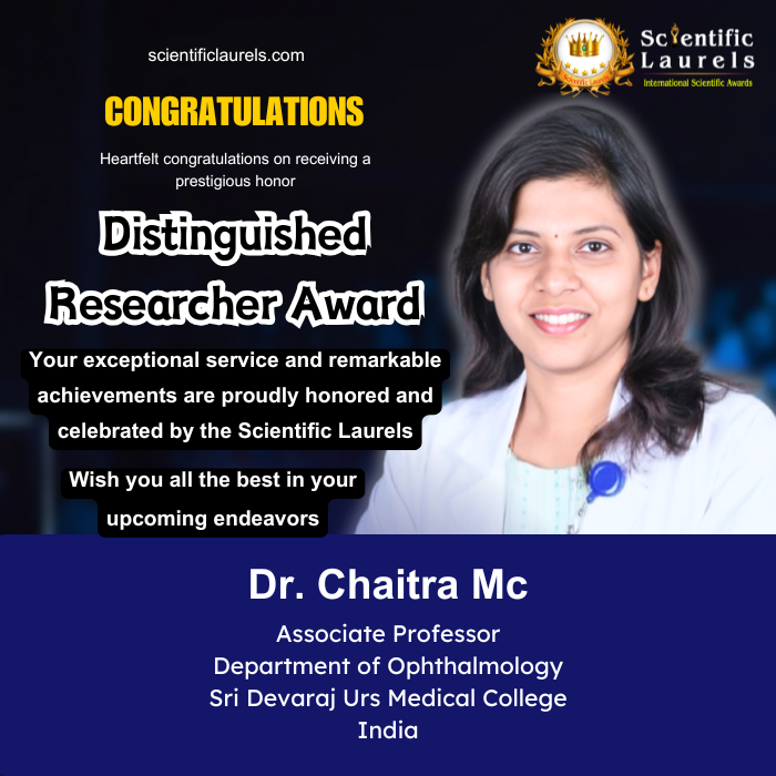 Based on her substantial publication record, ongoing and completed funded research projects, active mentorship and academic service, and international recognition through keynote and oral presentations, Dr. Chaitra Mc is highly eligible for the Distinguished Researcher Award by Scientific Laurels. Her sustained contributions to ophthalmic research, interdisciplinary collaboration, and academic leadership clearly meet and exceed the criteria for this prestigious recognition.