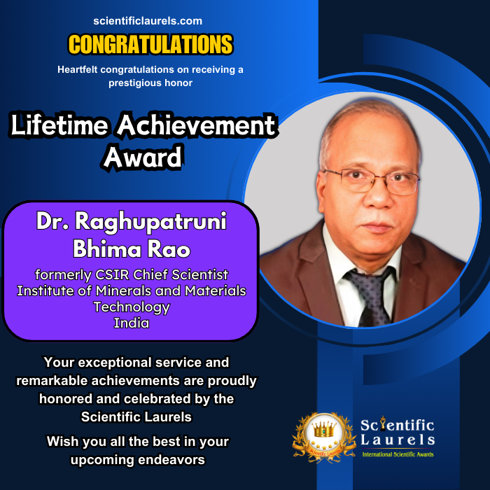 Due to his exemplary work on beneficiation, a few beneficiation plants have been set up in India. The know–how on use of additives in grinding for energy saving in comminution plants has been accepted by few mineral industries. To his credit he has a few patents and more than 300 publications in International and National journals among these publications beach placer mineral publications are accounting to 115. He has delivered a large number of invited lecturers in National and International organizations. He is fellow and life members for many organized many seminars, symposia and workshops. His main fields of interests are comminution, process flow sheet development for lean and off grade ores, waste recycling and utilization. In this area he is expert member for various Government organizations such as Member for Bureau of Indian Standards, UPSC, SSC, BRNS, UGC, CSIR, DST, and Government of India and for few academic institutions. Now his vitae is published in the International Directory of Distinguished Leadership and is a Board of Advisors for the American bibliographical Institute professional societies and fulfilled his duties as president and as secretary. He has. He is Chief Editor and editor for many international and national journals. He has produced a few Ph D and M. Tech degree awarded students in the area of mineral processing. He has received many Gold and Silver Medals and certificates for his best papers and recognitions especially in the area of additives in grinding. The National Mineral Award in the area of mineral beneficiation (instituted under the National Mineral Award Scheme of Ministry of Mines) is one of his prestigious recognitions. He also received the international award Asia Pasific Engineer of the year 2024 award. An award has been introduced in the name of Dr. Raghupatruni Bhima Rao in the area of Chemical Engineering for best papers published in the annual technical volume of IEI, OSC, Bhubaneswar.