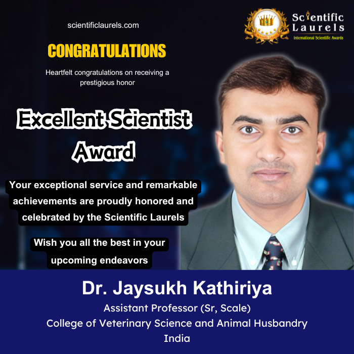 Dr. J. B. Kathiriya, Ph.D. in Veterinary Microbiology, is a distinguished researcher and educator with extensive experience in veterinary public health, microbiology, and epidemiology. He has held key academic positions, currently serving as a Professor (Assistant-Senior Scale) at Kamdhenu University, Junagadh, India, since April 2021. Prior to this, he contributed significantly at Junagadh Agricultural University and the National Institute of Occupational Health (ICMR).