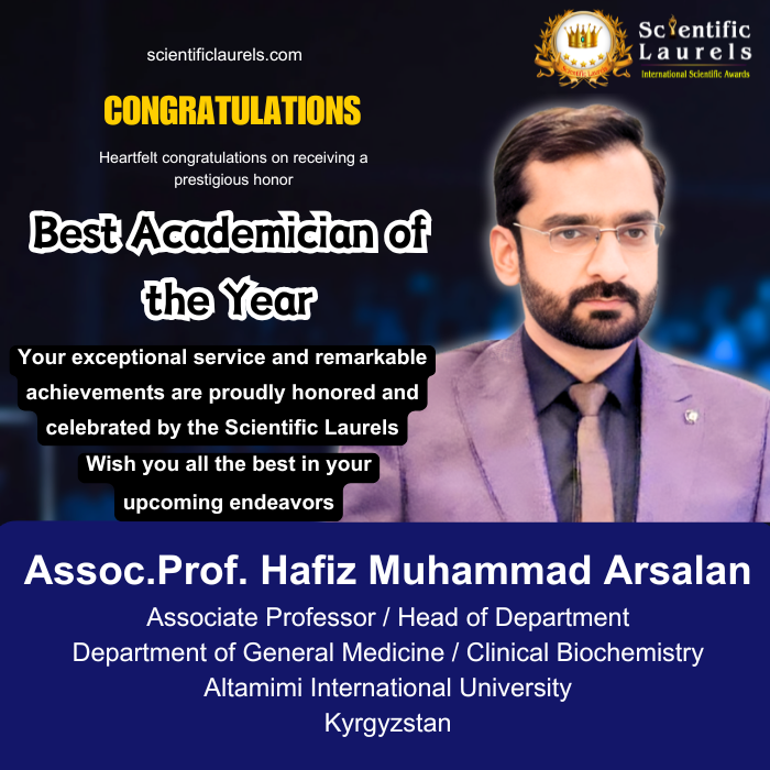 Assoc. Prof. Hafiz Muhammad Arsalan is highly eligible for the Best Academician of the Year – Scientific Laurels award due to his notable contributions to academic leadership, research, and professional development in the field of Clinical Biochemistry. Serving as Associate Professor and Head of the Department of Clinical Biochemistry (Faculty of General Medicine) since October 01, 2024, he has demonstrated strong commitment to teaching excellence, research advancement, and institutional development. His scholarly profile includes peer-reviewed publications and a significant book chapter on biomarkers of endometriosis published in Advances in Clinical Chemistry, reflecting his engagement in impactful scientific research. In addition, he has published numerous conference abstracts and other scholarly works, showcasing consistent research productivity. His participation in many workshops and seminars further highlights his dedication to continuous learning and academic collaboration. Through his contributions to medical education, research dissemination, and professional leadership, Assoc. Prof. Hafiz Muhammad Arsalan fulfills the key criteria for the Best Academician of the Year recognition.