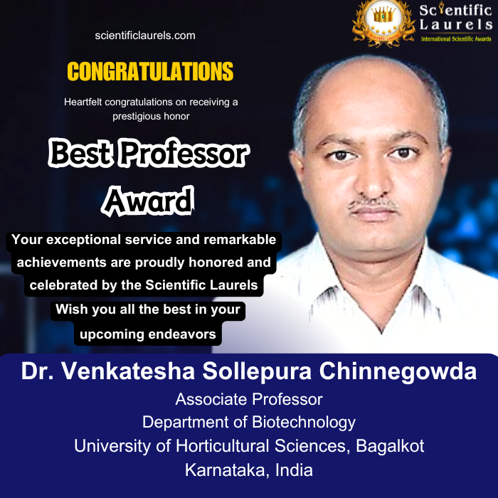 Dr. Venkatesha Sollepura Chinnegowda’s sustained research excellence, international collaborations, impactful publications, and active engagement in training and capacity building make him highly eligible for the Best Professor Award in Scientific Laurels. His work has significantly contributed to the conservation, genetic improvement, and molecular characterization of key horticultural and underutilized crops.