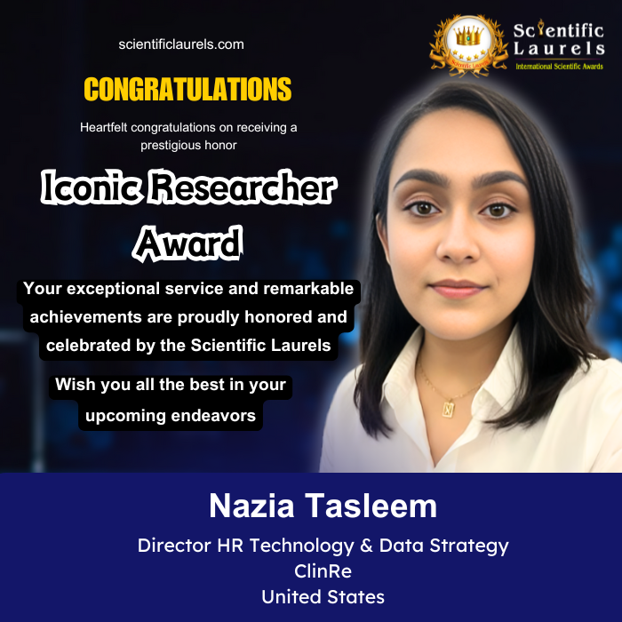 Nazia Tasleem exemplifies the essence of the Scientific Laurels Iconic Researcher Award—integrating academic rigor, original innovation, and societal relevance. Her pioneering research in AI-enabled HR systems, combined with a proven record of enterprise-scale transformation and global thought leadership, distinguishes her as a visionary redefining how organizations use technology to enhance human potential.