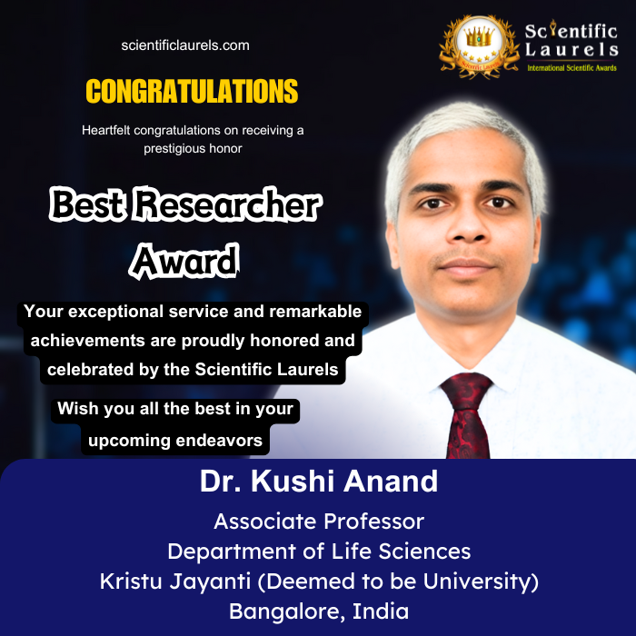Dr. Kushi Anand is serving as an Associate Professor of Life Sciences at Kristu Jayanti University, Bengaluru. He completed his doctoral studies at VIT University, where he was awarded a Merit Fellowship for his research on biomolecules that suppress cancer angiogenesis, which led to the identification of dietary compounds with anti-tumor effects.