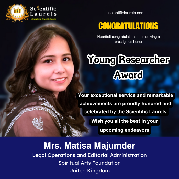 Mrs. Matisa Majumder demonstrates strong eligibility for the Young Researcher Award in Scientific Laurels owing to her consistent scholarly output, multidisciplinary contributions, and impactful research addressing contemporary societal, technological, and legal challenges. Her publications span high-relevance domains such as AI-law intersections, mental health, cultural identity, child safety, and digital ethics—areas that directly contribute to academic advancement and public understanding. Her ongoing international projects, editorial leadership role in the UK, and active engagement with emerging research themes further strengthen her profile as a distinguished and influential researcher in the humanities, law, and social-science interface.