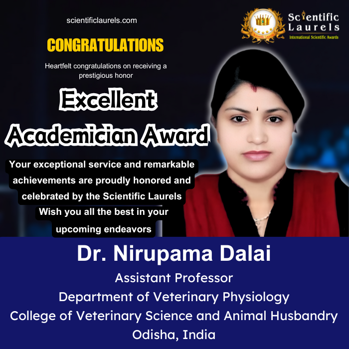 In view of her consistent academic performance, significant teaching contributions, strong publication record, authorship of academic books, active participation in conferences, and multiple national-level recognitions, Dr. Nirupama Dalai is highly eligible for the Excellent Academician Award under Scientific Laurels. Her sustained commitment to veterinary education, research excellence, and student-centric learning justifies her nomination for this prestigious academic honor.
