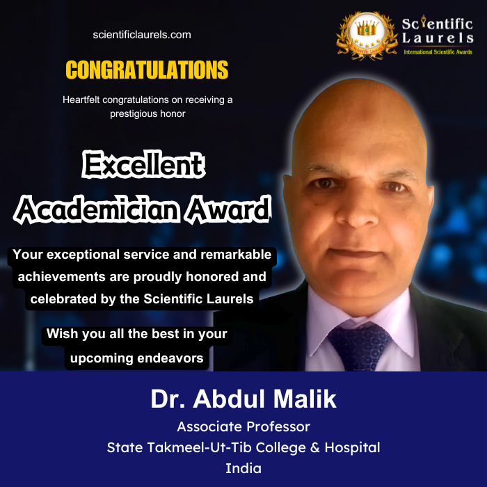 Given his extensive contributions to education, research, and publishing, Dr. Abdul Malik is an exemplary candidate for the Excellent Academician Award under the Scientific Laurels program. His work epitomizes the mission of fostering innovation, advancing scientific knowledge, and inspiring the next generation of healthcare professionals.