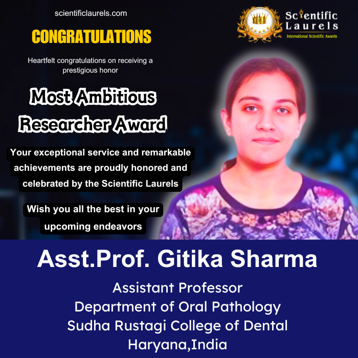 Based on her consistent research productivity, multidisciplinary research focus, international and national publications, award-winning presentations, authorship of a scholarly book, and sustained academic engagement, Asst. Prof. Gitika Sharma clearly fulfills and exceeds the criteria for the Most Ambitious Researcher Award under Scientific Laurels. Her trajectory reflects ambition, innovation, and a strong commitment to advancing oral pathology research with translational impact, making her a highly deserving candidate for this recognition.