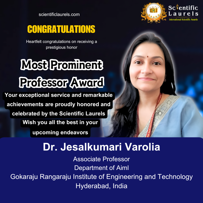 Dr. Jesalkumari Varolia is highly eligible for the Most Prominent Professor Award (Scientific Laurels) due to her exemplary contributions to teaching, research, and academic leadership. With over a decade of impactful teaching experience, a strong portfolio of research publications, and a recently published AI-based patent, she has demonstrated innovation and scholarly excellence. Her active engagement in professional development, global academic collaborations, and student mentorship highlights her commitment to advancing higher education. Additionally, her certifications, recognitions, and leadership roles in organizing academic initiatives underscore her influence in the scientific and educational community, making her a deserving candidate for this prestigious honor.