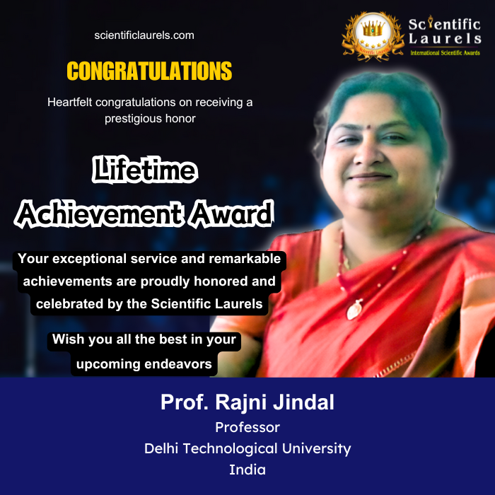 In recognition of her exceptional contributions to research, academic leadership, and innovation, Prof. Rajni Jindal is deemed eligible for the Lifetime Achievement Award by Scientific Laurels. Her extensive research output, leadership in PhD supervision, and authorship of influential academic books establish her as a distinguished figure in Computer Science and Engineering.
