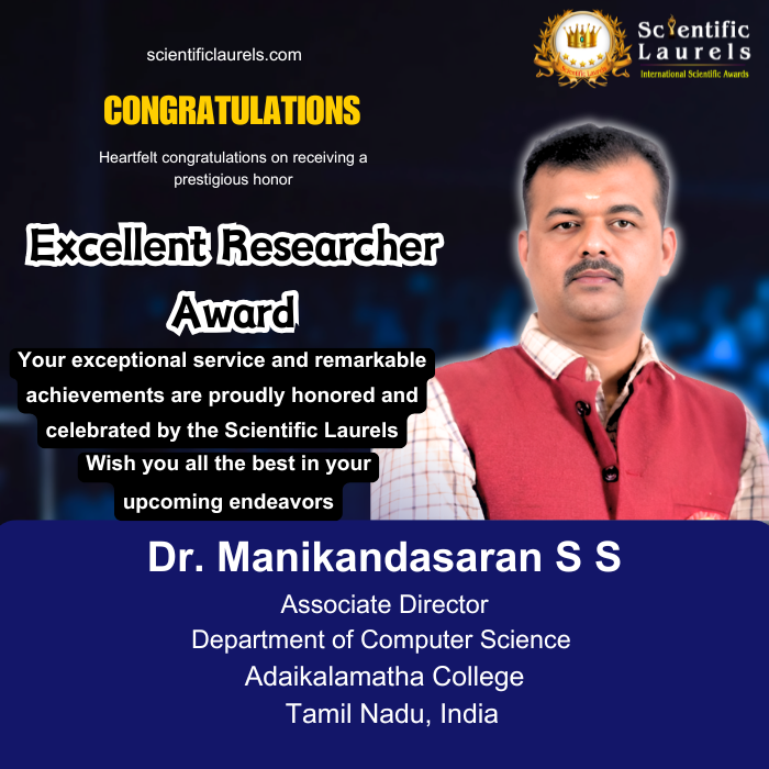 Dr. S. S. Manikandasaran is highly eligible for the Excellent Researcher Award (Scientific Laurels) based on his outstanding academic and research credentials. His extensive publication record (78 works), innovative patents, and authorship of impactful books reflect a sustained contribution to scientific advancement. Additionally, his active involvement in organizing academic events, delivering expert lectures, and mentoring researchers highlights his influence in the academic community. His international exposure, research grants, and recognition through awards further strengthen his profile, making him a deserving candidate for this prestigious honor.