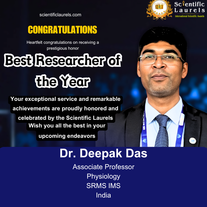 Dr. Deepak Das is highly deserving of the “Best Researcher of the Year” award owing to his exceptional contributions to clinical research in hypertension, diabetes, and cardio-metabolic disorders. With numerous peer-reviewed publications, repeated national recognitions—including the RB Singh Gold Medals, Investigator of the Year (2018), Young Investigator Fellowship (APSH-2021), and Scientist of the Year (ISCCON-2023)—he has demonstrated consistent research excellence and innovation. His active involvement as faculty and presenter at major national and international conferences, leadership in organizing scientific events, and role as co-investigator in multicentric studies highlight both his academic depth and commitment to advancing medical science. Dr. Das’s impactful work in cardiovascular physiology, metabolic health, and public-health initiatives positions him as an outstanding candidate for the “Best Researcher of the Year” in scientific laurels.
