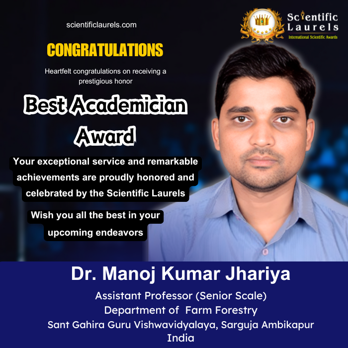 Dr. Manoj Kumar Jhariya’s exceptional academic achievements, sustained research productivity, global recognition, and consistent inclusion among the World’s Top 2% Scientists establish him as a highly deserving candidate for the Best Academician Award in Scientific Laurels. His blend of scholarly rigor, publication excellence, and commitment to sustainable development strongly align with the spirit of this prestigious award.