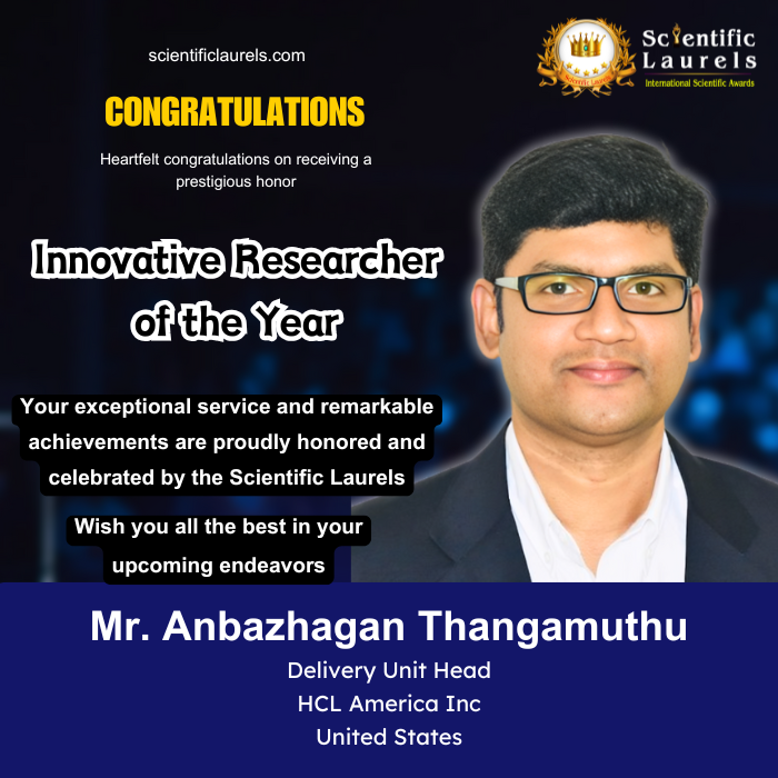 Mr. Anbazhagan Thangamuthu exemplifies innovation in both technological deployment and strategic leadership. His transformative impact on Generative AI applications, ability to drive modernization at scale, and commitment to sustainable and intelligent infrastructure solutions make him a highly deserving recipient of the Innovative Researcher of the Year under the Scientific Laurels category.
