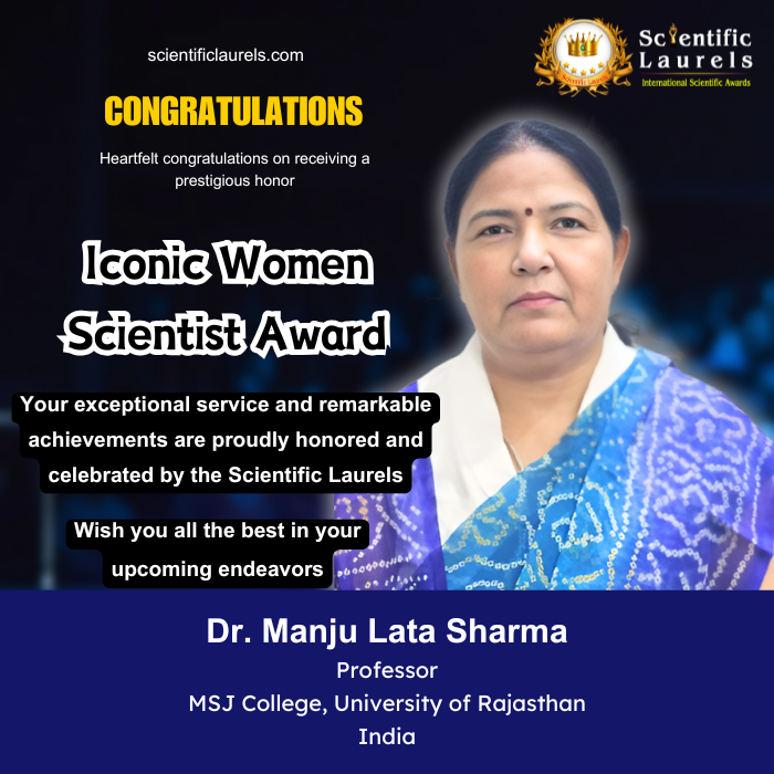 With her extensive contributions to science and academia, Dr. Manju Lata Sharma is a deserving candidate for the Iconic Women Scientist Award in Scientific Laurels. Her research, publications, and innovative contributions underscore her commitment to advancing scientific knowledge and improving human health.