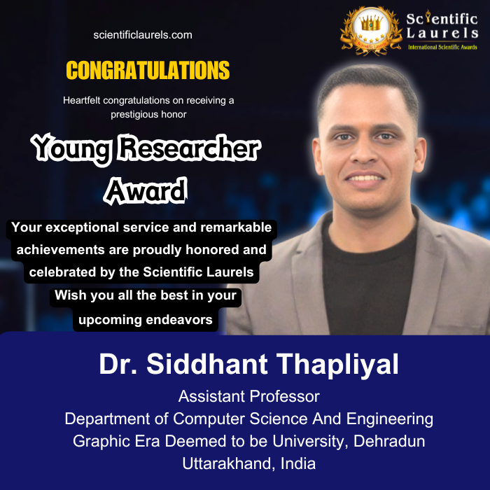 Dr. Siddhant Thapliyal is highly eligible for the Young Researcher Award (Scientific Laurels) owing to his exceptional early-career achievements and impactful contributions to the fields of cybersecurity, Internet of Things (IoT), and intelligent systems. He has demonstrated outstanding research productivity with more than 70 Scopus-indexed publications and 10 SCI papers, reflecting both consistency and academic excellence. His innovative capabilities are further evidenced by a published Indian patent on a lightweight cybersecurity-enabled smart health monitoring system. His research work addresses critical challenges in emerging domains such as smart healthcare, Internet of Vehicles (IoV), and AIoT-enabled environments, showcasing both relevance and real-world applicability. In addition to his strong research profile, his involvement in developing practical projects and mentoring students highlights his commitment to academic and technological advancement. Collectively, his originality, technical depth, and significant contributions at an early stage of his career make him a deserving candidate for this prestigious recognition.