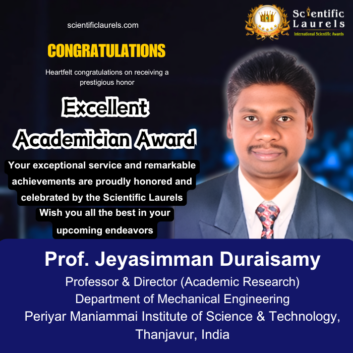 Prof. Jeyasimman Duraisamy is highly eligible for the Excellent Academician Award in recognition of his outstanding contributions to academic leadership, research excellence, and innovation in Mechanical Engineering. Serving as Professor and Director (Academic Research) at Periyar Maniammai Institute of Science & Technology, he has demonstrated strong commitment to advancing research culture and scholarly development. With 53 research publications, including 16 indexed in Web of Science, several SCIE and Scopus-indexed articles, and three international book chapters, he has established significant academic impact in advanced materials and high entropy alloys research. His achievements include securing funded research projects, publishing in reputed international journals, holding seven patents, receiving 16 academic awards, and fostering international collaborations. Additionally, his active role in delivering invited lectures and organizing academic events reflects his dedication to academic excellence and mentorship. His sustained research productivity, innovation, and academic leadership make him a deserving candidate for the Excellent Academician Award.