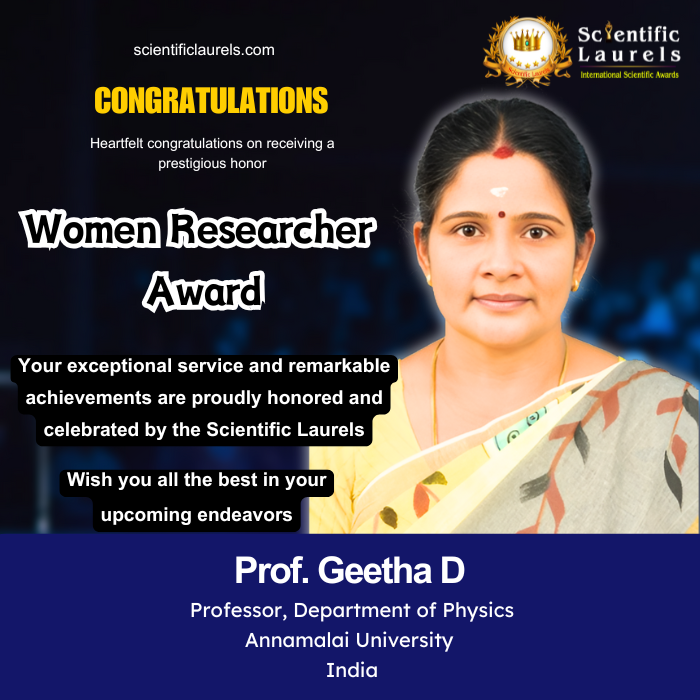 With over two decades of impactful teaching, nearly three decades of cutting-edge research, an exceptional record of publications, books, and funded projects, Prof. Geetha D exemplifies excellence in scientific inquiry and mentorship. Her sustained contributions to materials science and biopolymer research, leadership in national and international collaborations, and commitment to advancing women in science make her highly deserving of the Women Researcher Award in Scientific Laurels.