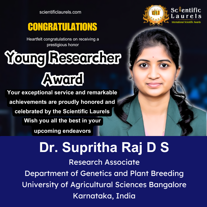 Dr. Supritha Raj D S is highly eligible for the Young Researcher Award (Scientific Laurels) due to her outstanding academic achievements, impactful research contributions in agricultural and allied sciences, consistent publication record, national and international awards, and recognition through competitive fellowships such as DST-INSPIRE. Her work in climate-smart crop breeding and advanced genomic approaches aligns strongly with current global research priorities, making her a deserving candidate for this prestigious early-career research honor.
