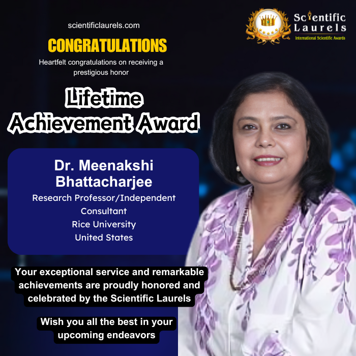 Prof. Dr. Meenakshi Bhattacharjee is an internationally renowned algal biotechnologist and cyanobacteriologist, with about 35 + years of extensive experience and research and have obtained fascinating results that forms the cutting edge of research internationally. She is Professor of Research at Rice University Houston Texas USA presently and before that she was Professor and Head of the Department of Bioscience and Dean Faculty of Life Sciences, Chairperson Board of studies, Chairperson Examination Committee of Bhopal University, India before moving to USA. The Indian Academy of Sciences, Bangalore India, published a book “Lilavati’s Daughters” profiling 100 top women scientists of India. She is profiled as number 12. Dr. Bhattacharjee was featured on the Cover page of the “Ojaswini Magazine” after winning the Ojeswini award honoring women scientists of repute. She has had the privilege of working in leading algae labs in Germany, UK and US on the prestigious DAAD, Commonwealth Fellowship and Department of Biotechnology Overseas Associateship respectively. 25 students have obtained their Ph.D. Under her supervision, 60 M.Phil., and over 300 M.Sc. students completed their dissertation under her. She has around 250 publications in internationally/nationally reputed journals. She has to her credit teaching experience of nearly 34 years of master's courses, M.Phil. courses and Ph.D. programs in Bioscience subjects both in India and USA. She has been decorated with several coveted awards and distinctions, both national and international, throughout her career. To mention a few are Albert Schweitzer International Medal for Science (UK), Netaji Subhash Chandra Bose Award for Environmental Biotechnology (UNESCO), K.N. Katju Award for outstanding achievements in Life science (Department of Science and Technology Govt. of India) and the World Oil Award in the category " Innovative Thinker" for her work on cleaning up and bioremediation of waste return fluid from oil wells, USA, 2017. She is a member /life member /Fellow of several scientific organizations, academies nationally and internationally. Recently in 2021 she has been the recipient of the International Scientist Lifetime Achievement Award and the Perficio Award and Trophy of Excellence for Lifetime Achievements 2022 and in 2023 was nominated for the award of one of the top 50 women leaders of Houston USA for outstanding achievements in Algal and Environmental biotechnology. Also, in 2023 she has been included in Marquis American Who’s and Who’s and Strathmore Who’s Who worldwide honors as Women of Excellence. She is also featured in the Spotlight, Summer of Science by the Association of Woman in Science USA. Also on International Womens Day 8 th March this year featured as “The Most Inspiring Women Educationalist 2024 on the cover page of Entrepreneurial Outlook Magazine USA, and an exclusive 5-page interview.