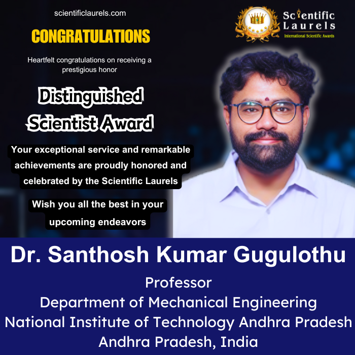 Dr. Santhosh Kumar Gugulothu’s outstanding contributions in mechanical engineering research, patents with societal impact, leadership in sponsored projects, and prolific publications make him highly eligible for a Distinguished Scientist Award in recognition of his scientific laurels. His work in sustainable energy solutions, advanced propulsion systems, and thermal management innovations demonstrates both scientific excellence and societal relevance, aligning with the highest standards of the award.
