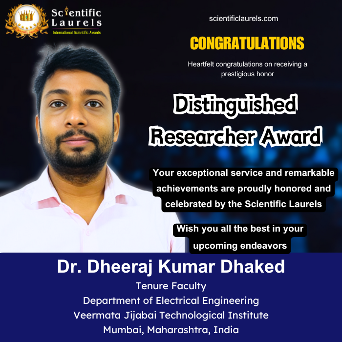 In recognition of his interdisciplinary research, technological innovation, and early-career academic excellence, Dr. Dheeraj Kumar Dhaked is highly eligible for the Distinguished Researcher Award in Scientific Laurels. His exceptional trajectory across premier IITs, funded research, patents, and high-impact publications distinguishes him as a leading voice in the future of sustainable and intelligent electrical systems.