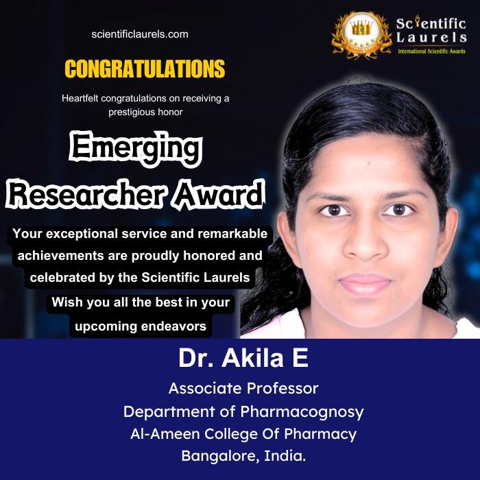 With her robust publication record, innovative patent contribution, successful research grants, impactful mentorship, and recognition through multiple awards, Dr. Akila E has demonstrated exceptional promise in research and academic leadership. Her pioneering work in plant-based nanotechnology and pharmacognosy positions her as a highly deserving recipient of the Emerging Researcher Award in Scientific Laurels.