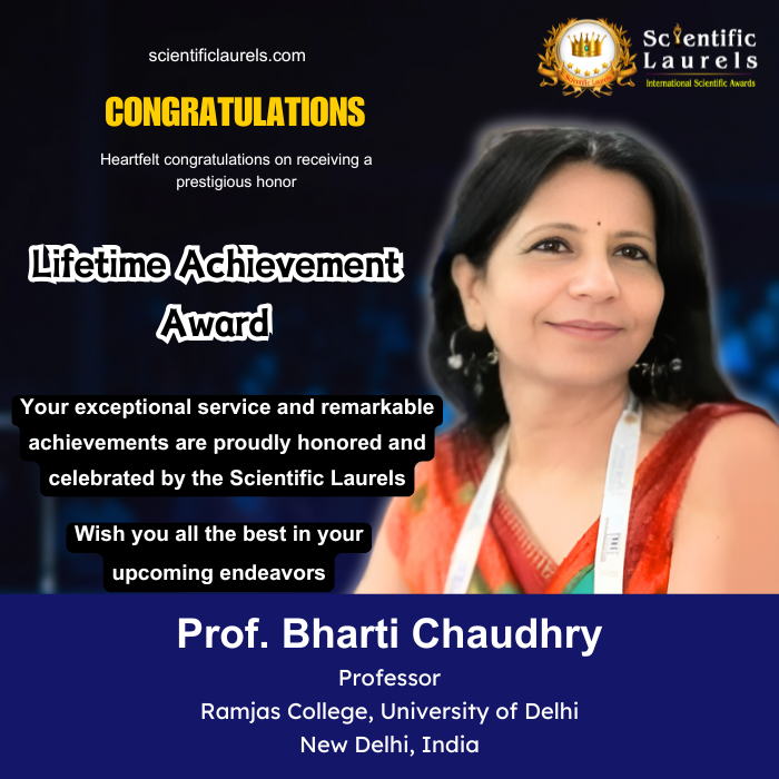 In recognition of her outstanding contributions to botanical research, medicinal plant studies, academic leadership, and teaching excellence, Prof. Bharti Chaudhry is eligible to receive the Lifetime Achievement Award in Scientific Laurels. Her dedication to plant sciences, Ayurveda, and institutional development makes her a truly deserving recipient of this prestigious honor.