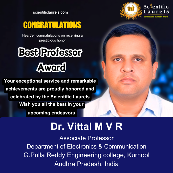 Dr. Vittal M. V. R. is an accomplished academician and researcher in the field of Electronics and Communication Engineering, with strong expertise in wireless communications, OFDM systems, antenna design, signal processing, embedded systems, and artificial intelligence applications. He has made sustained contributions to teaching, research, peer review, and professional service, particularly within globally recognized technical communities such as IEEE.