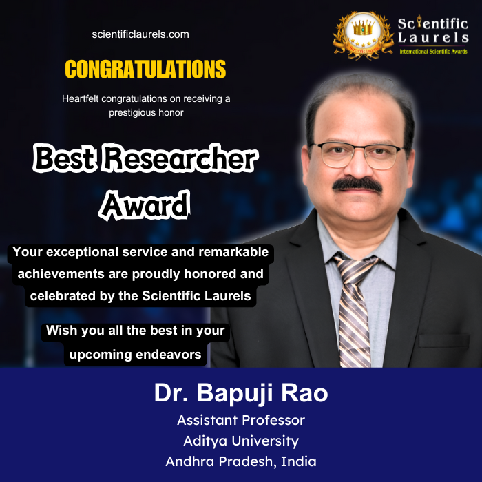 Dr. Bapuji Rao is an experienced academician and researcher with over 23 years of diverse experience in teaching, research, and academic guidance. His extensive career spans multiple renowned institutions across India. He is currently serving as an Assistant Professor in the Department of Computer Applications at Aditya University, Surampalem, Andhra Pradesh (since April 2025) Previously, he held faculty positions at SRMIST (Delhi-NCR), Indira Gandhi Institute of Technology (Odisha), K.L. University (AP), and several other engineering and technical institutions.