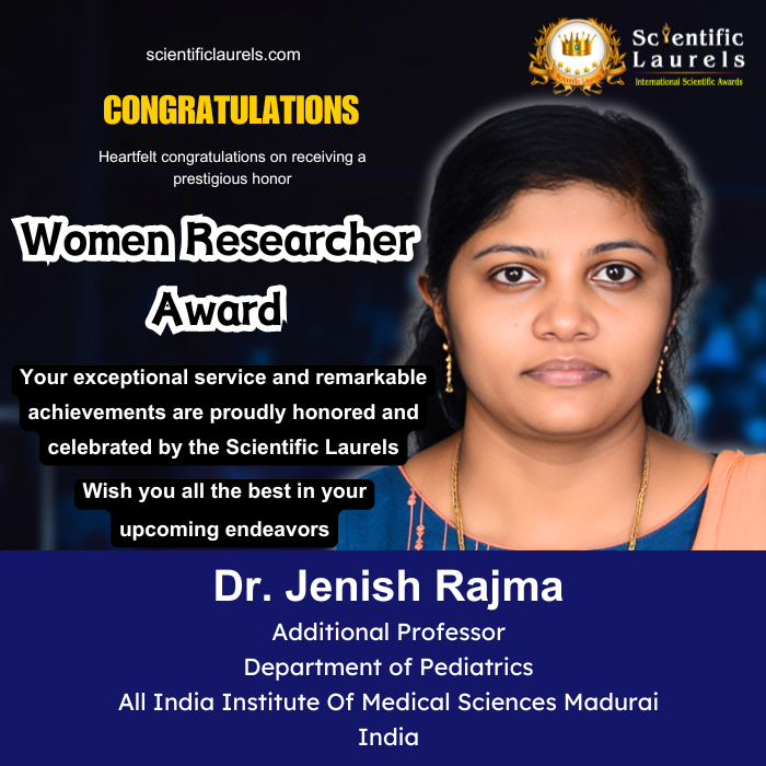Given her exceptional contributions in pediatric research, her commitment to academic excellence, and her leadership roles in training and clinical education, Dr. Jenish Rajma is highly eligible for the Women Researcher Award in Scientific Laurels. her work in improving child health through research, education, and clinical practice exemplifies the qualities celebrated by this award.
