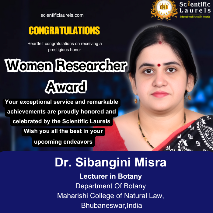 Dr. Sibangini Misra is a dedicated botanist currently serving as a Lecturer in Botany at Maharishi College of Natural Law, Bhubaneswar, under the Higher Education Department, Government of Odisha. She possesses a strong academic foundation, consistently distinguished by top rankings throughout her educational journey. Her exceptional academic performance earned her several prestigious university and college awards, including multiple gold medals and memorial awards recognizing her as the Best Graduate and Best Post-Graduate of her university.