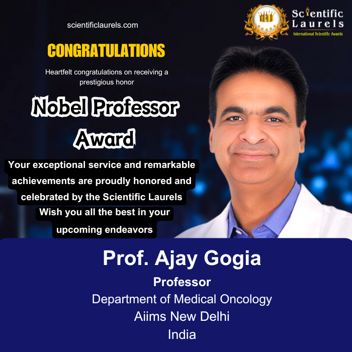 Prof. Ajay Gogia’s extraordinary scientific productivity, global research impact, high-value clinical innovations, and international recognition place him among the most deserving candidates for the Nobel Professor Award in Scientific Laurels. His sustained contributions to oncology research, education, and patient care—combined with publication in the world’s top medical journals, major international fellowships, and leadership in global health forums—clearly meet and exceed the criteria for this prestigious academic honor.